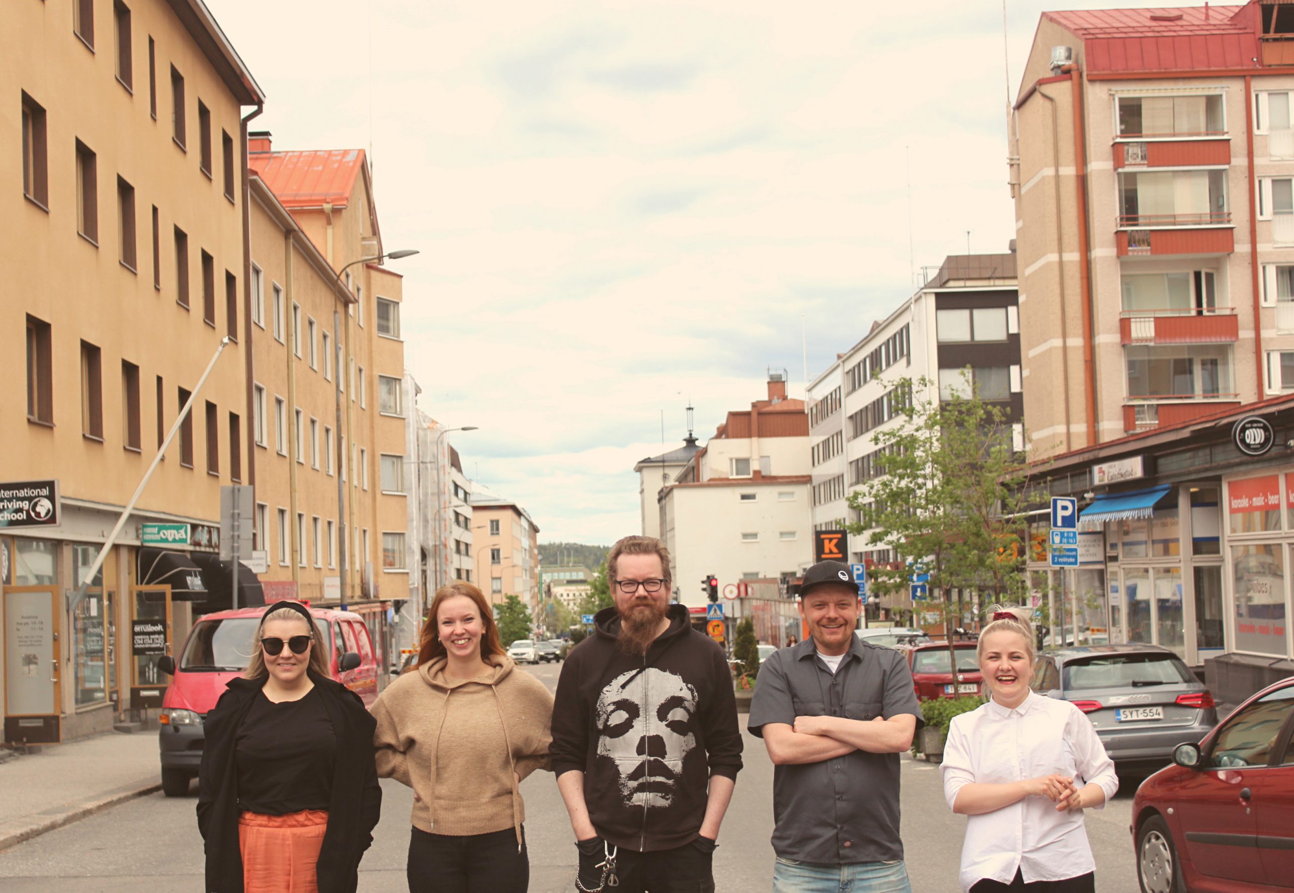 Kuvassa Yläkaupungin Yön kevätkauden 2020 tuotantotiimi: toiminnanjohtaja Marko Kainulainen, tuottaja Tomas Ojapelto sekä tuotantoassistentit Silja Niskanen, Mimi Steffansson ja Linda Arola.